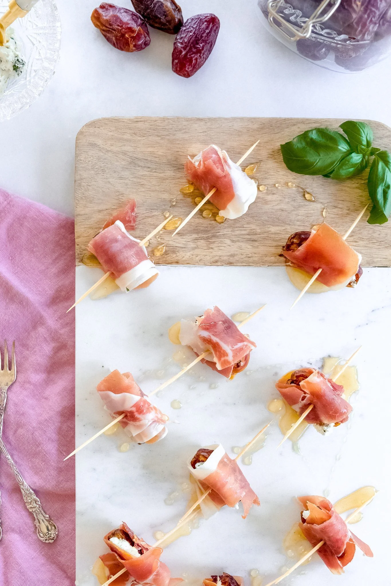 *The fastest way to make this recipe is to work in batches. I like to half & pit all the dates first, then slice the prosciutto, then stuff each date with cheese, and finally wrap each date with prosciutto & secure with a toothpick.
