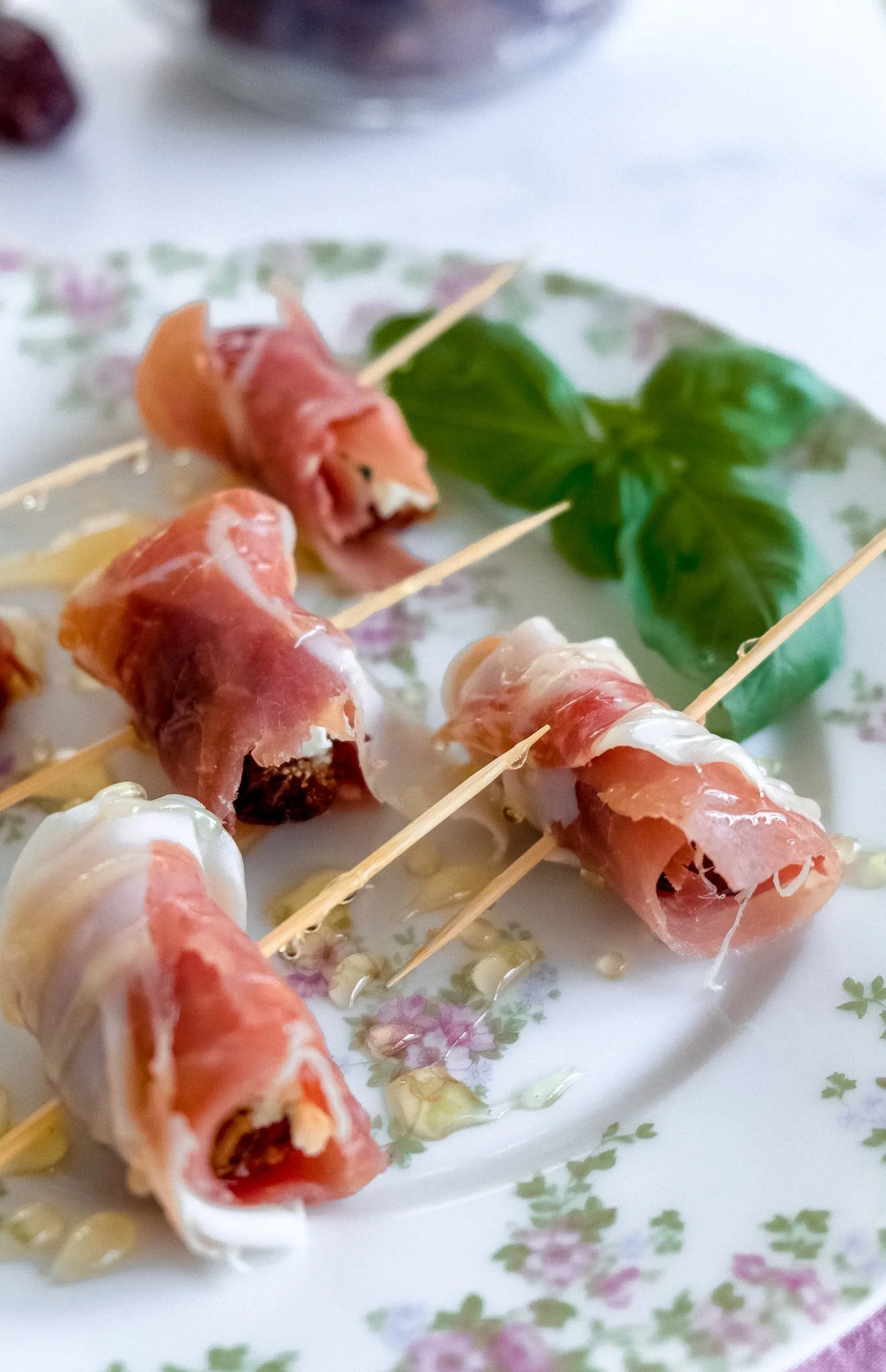 Wrap a piece of prosciutto around each date and secure with a toothpick.