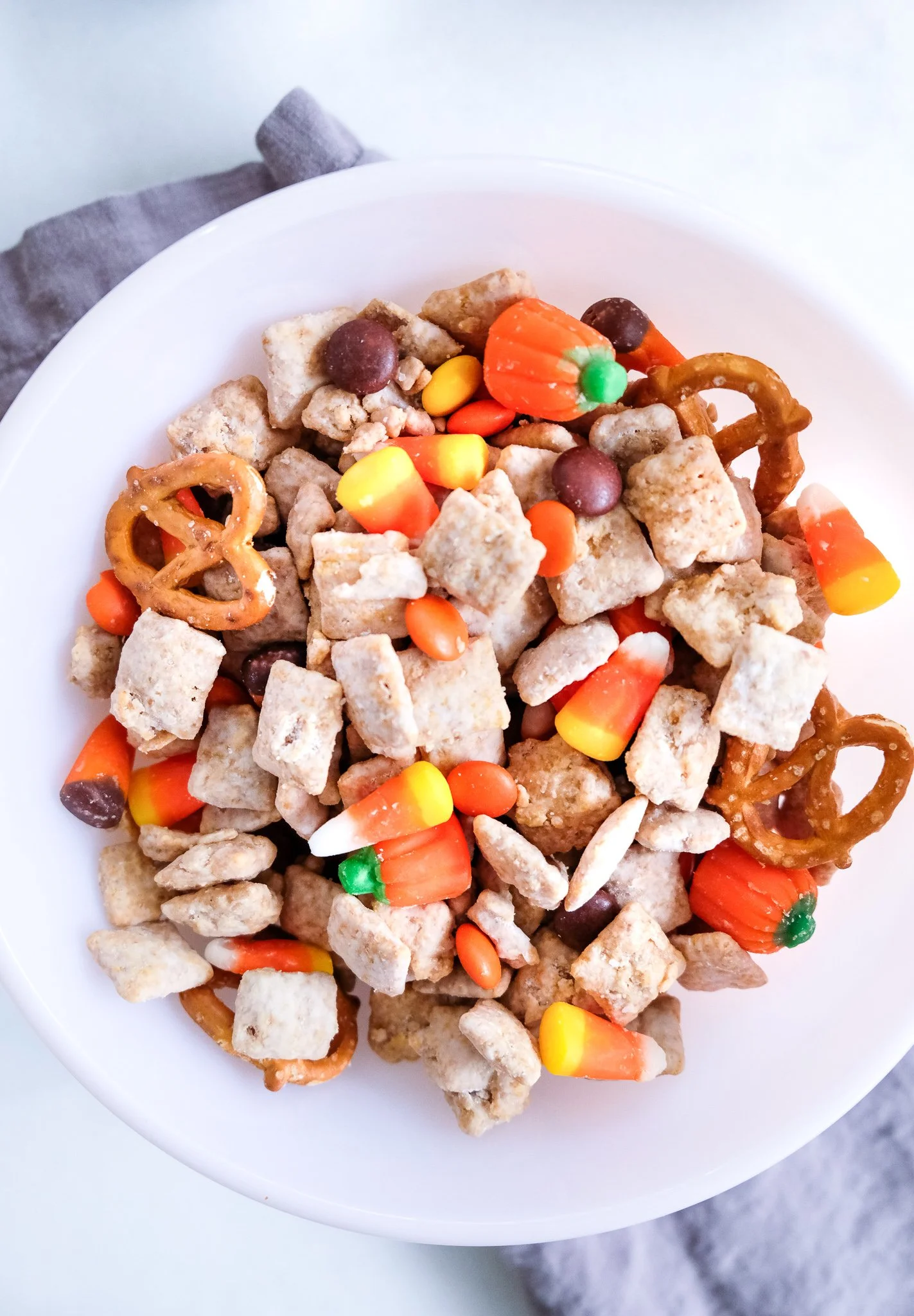 Add the coated Chex mix back to the large bowl and add candy corn autumn mixture, mini-pretzels, and Reese’s Pieces. Toss to mix.